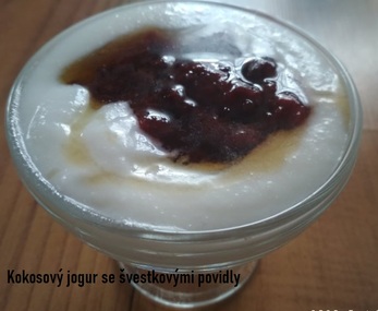 Snídaně: šťáva z grepu, kokosový jogurt s marmeládou