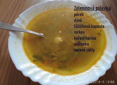 Večeře: zeleninová omáčka s čerstvým napařeným hráškem/cibule, cuketa, paprika, mrkev/ s jáhly a kvašená zelenina, listy salátu, ředkvičky