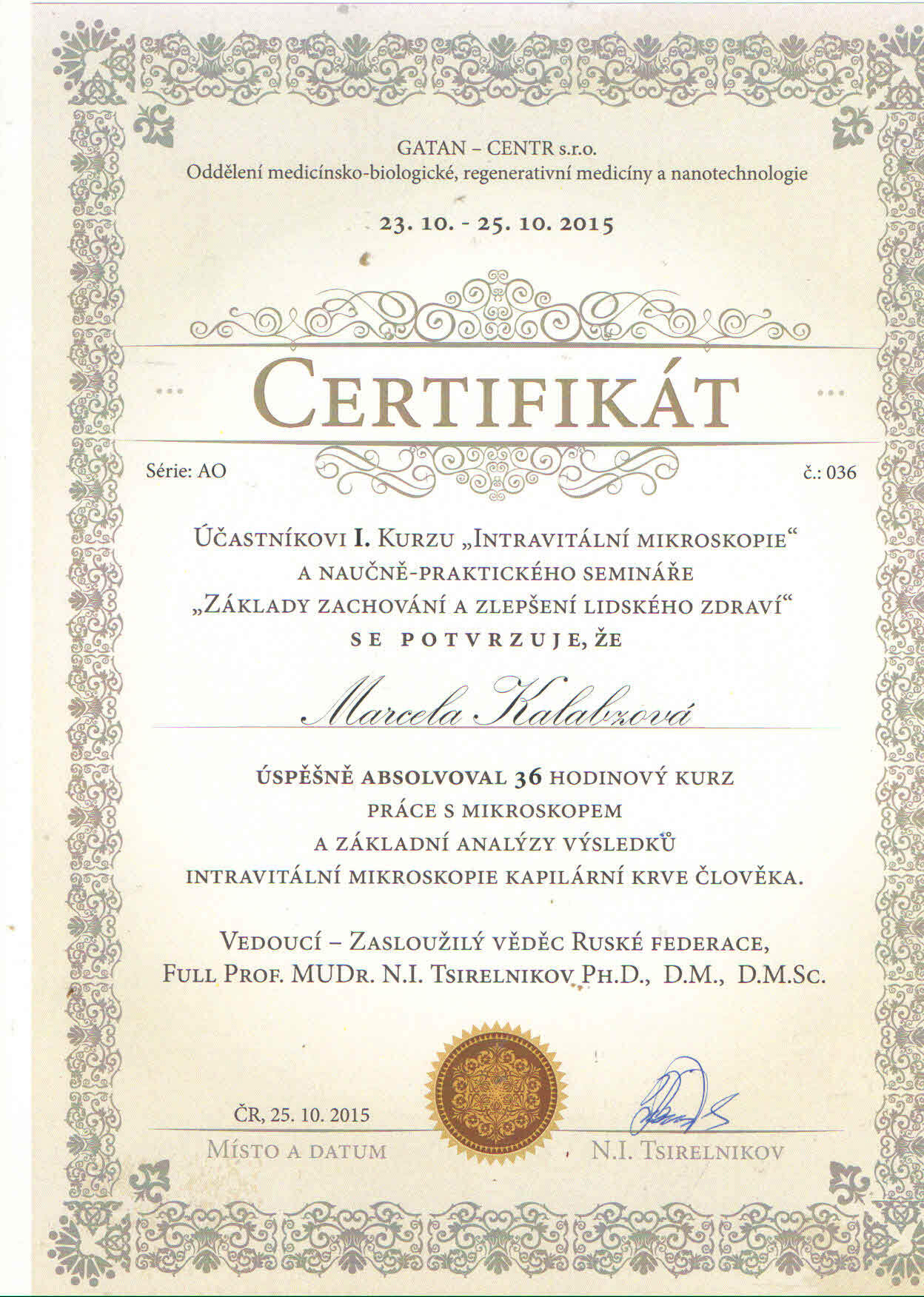 Všichni zúčastnění získají certifikáty o absolvovaní školicího semináře pana profesora N.I. Tsirelnikova.