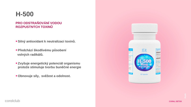 H 500-vodík v přírodní dostupné formě. Účinně rozpouští toxiny, krystaly močové kyseliny, prokysličuje krev, dodává elektrony buňkám pro přenos kyslíku a odstraňuje překyselení.