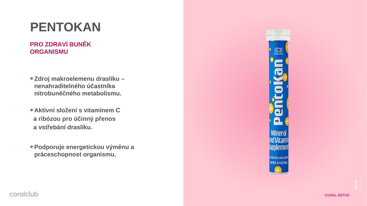 PentoKan — zásobuje buňky draslíkem, mimořádně důležitým prvkem nitrobuněčného metabolismu. Podporuje energetickou výměnu a práceschopnost organismu.
