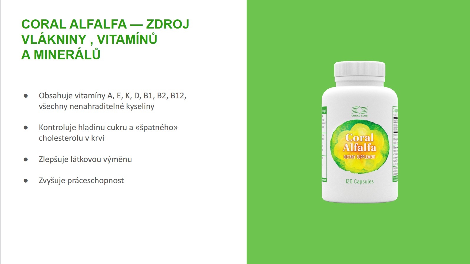 Ve složení Coral Alfalfa najdete nejen prášek z byliny, ale i šťávu rostliny, což zvyšuje výživovou hodnotu produktu.