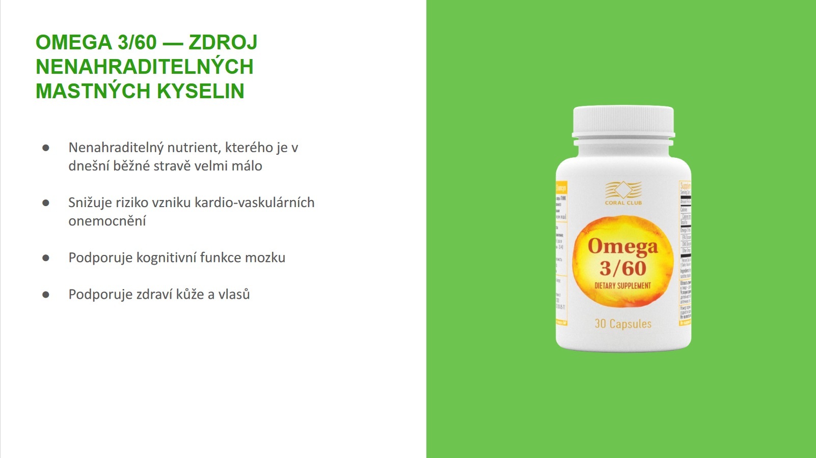 Zdroj polynenasycených mastných kyselin (PUFA), které lidský organismus nedokáže syntetizovat a které se do něj mohou dostat pouze prostřednictvím stravy. PUFA Omega-3 jsou součástí buněčných stěn, účastní se syntézy hormonů, napomáhají snížení hladiny cholesterolu. Dostatečný přísun PUFA Omega 3 je mimořádně důležitý pro činnost mozku, srdce, zraku a kůže. Produkt je vyroben z přirozeného tuku mořských ryb.