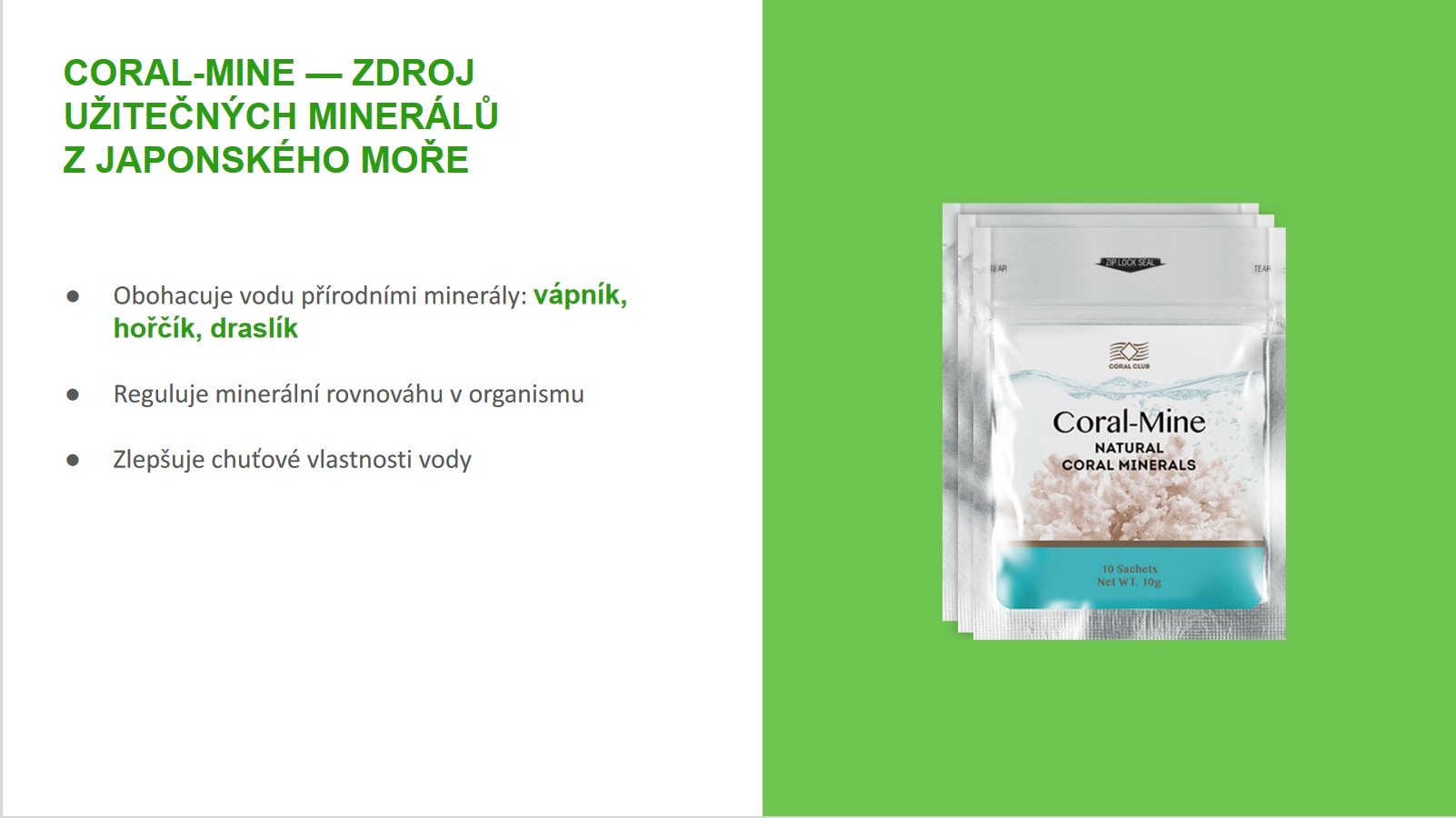 Minerální kompozice z korálů rodu scleractinia, obsahující soli užitečných makro- a mikroelementů (vápníku, hořčíku, draslíku, ale také železa, fosforu, síry, křemíku, chromu, manganu, zinku a dalších). Při styku s vodou přecházejí minerály Coral-Mine ze solí do vody, zlepšují její fyziologickou plnohodnotnost, upravují minerální složení, acidobazickou rovnováhu a zlepšují její organoleptické vlastnosti