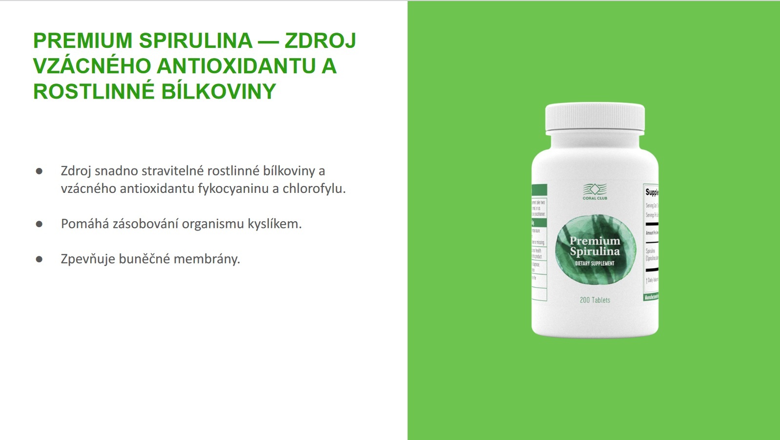 100% přírodní složení, neobsahuje žádné pomocné látky. Spirulina – to je pokladnice biologicky aktivních látek: rostlinných bílkovin, chlorofylu, vzácného antioxidantu – fykocyaninu, vitamínů C, E, B, beta-karotenu, minerálů a polynenasycených mastných kyselin. Napomáhá zlepšení látkové výmeny, pomáhá kontrolovat váhu a chrání před předčasným stárnutím.