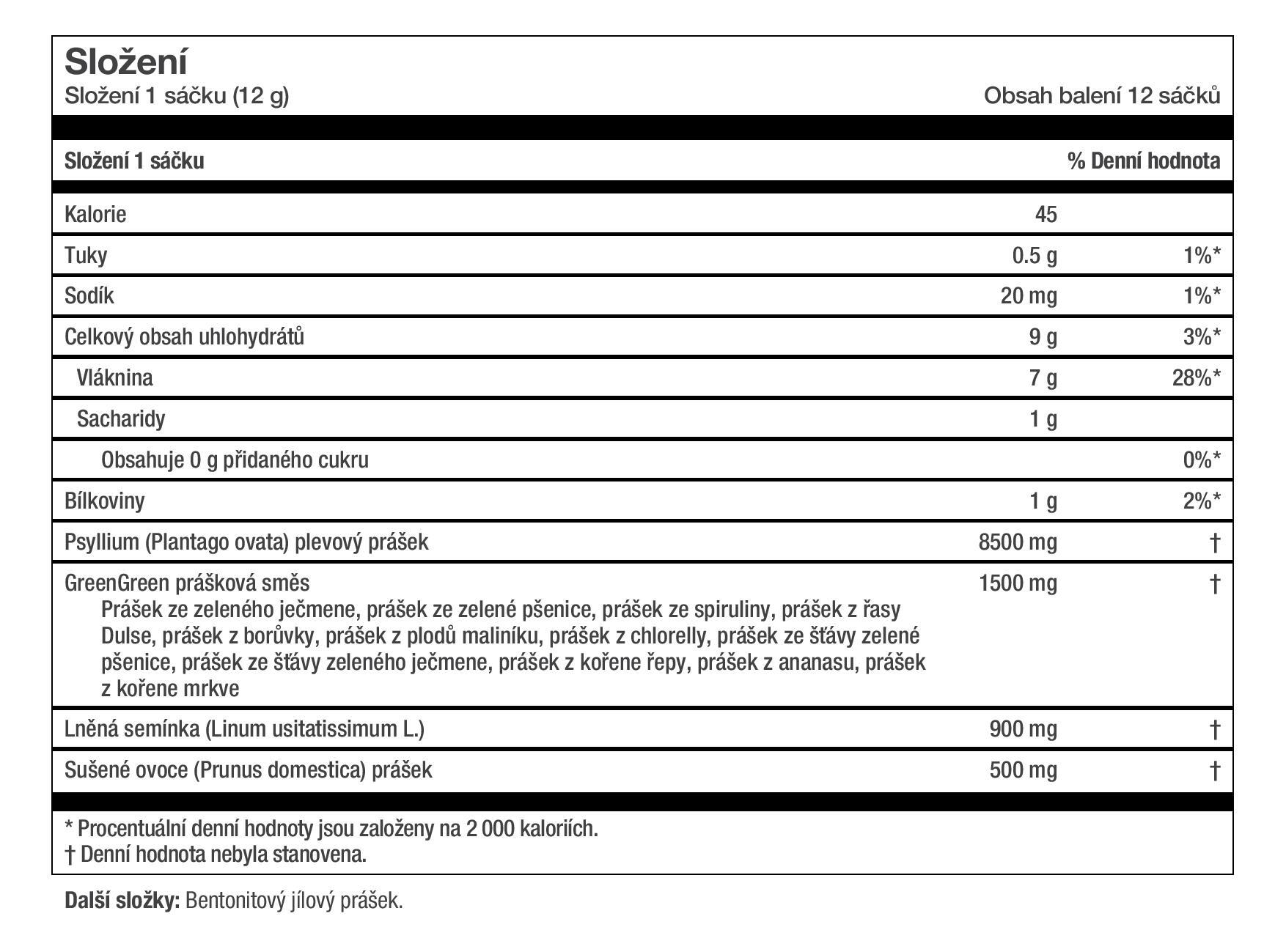 Aktivní složky prášku – slupka semen jitrocele, semena lnu a sušené švestky, jsou zesíleny nerozpustnou vlákninou souboru GreenGreen.