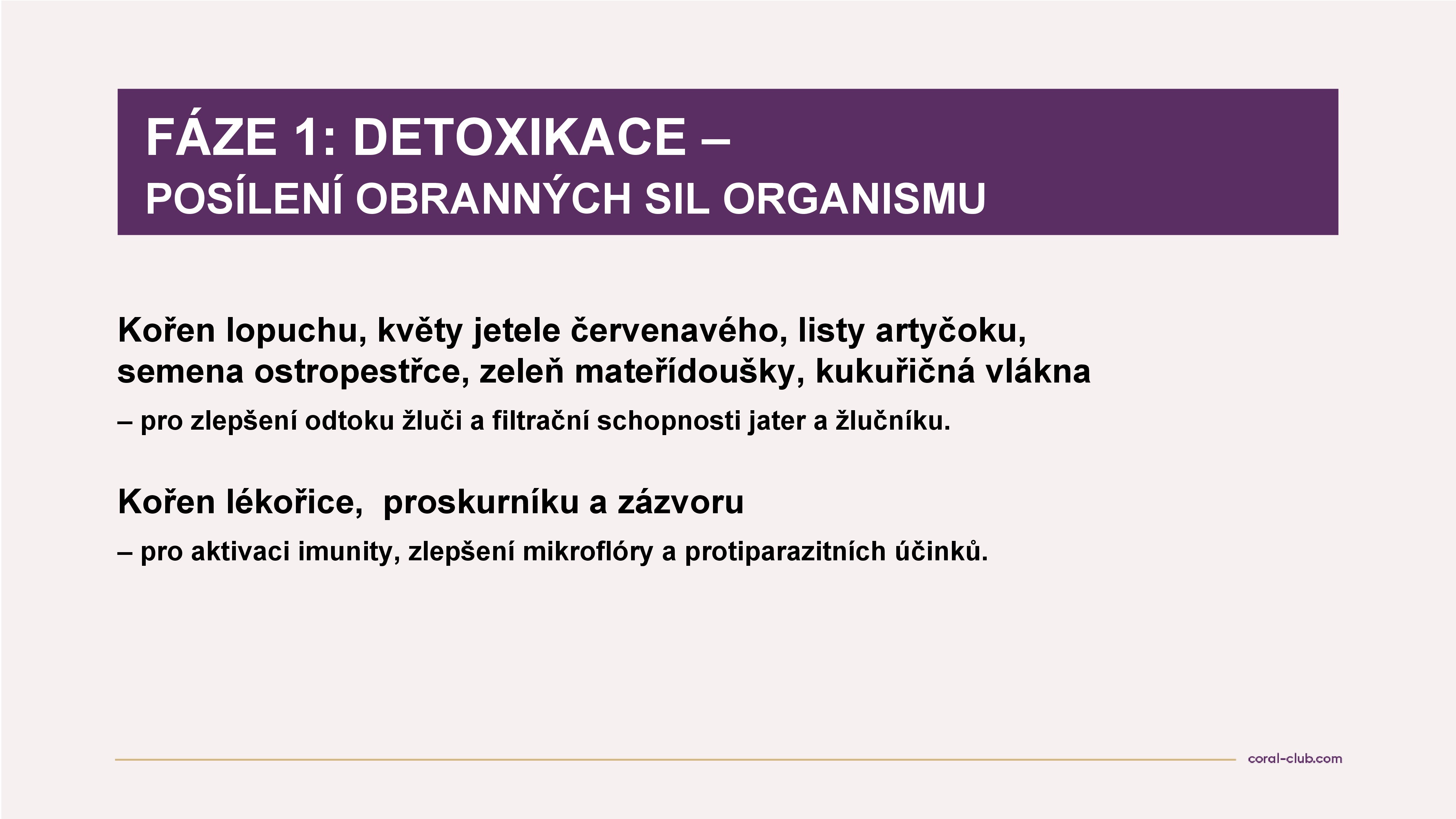 První fáze programu se skládá ze tří rostlinných souborů, jejichž aktivní složky aktivují detoxikaci a posilují obranné síly organismu.