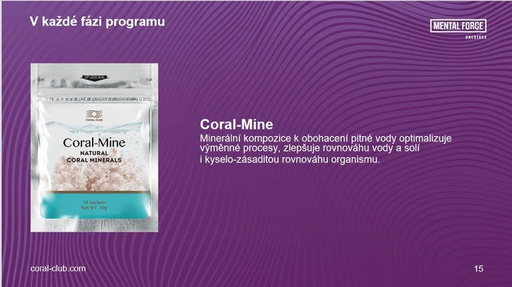 během procházení programu se doporučuje vypít denně minimálně 1,5 litru vody s minerální kompozicí Coral-Mine;