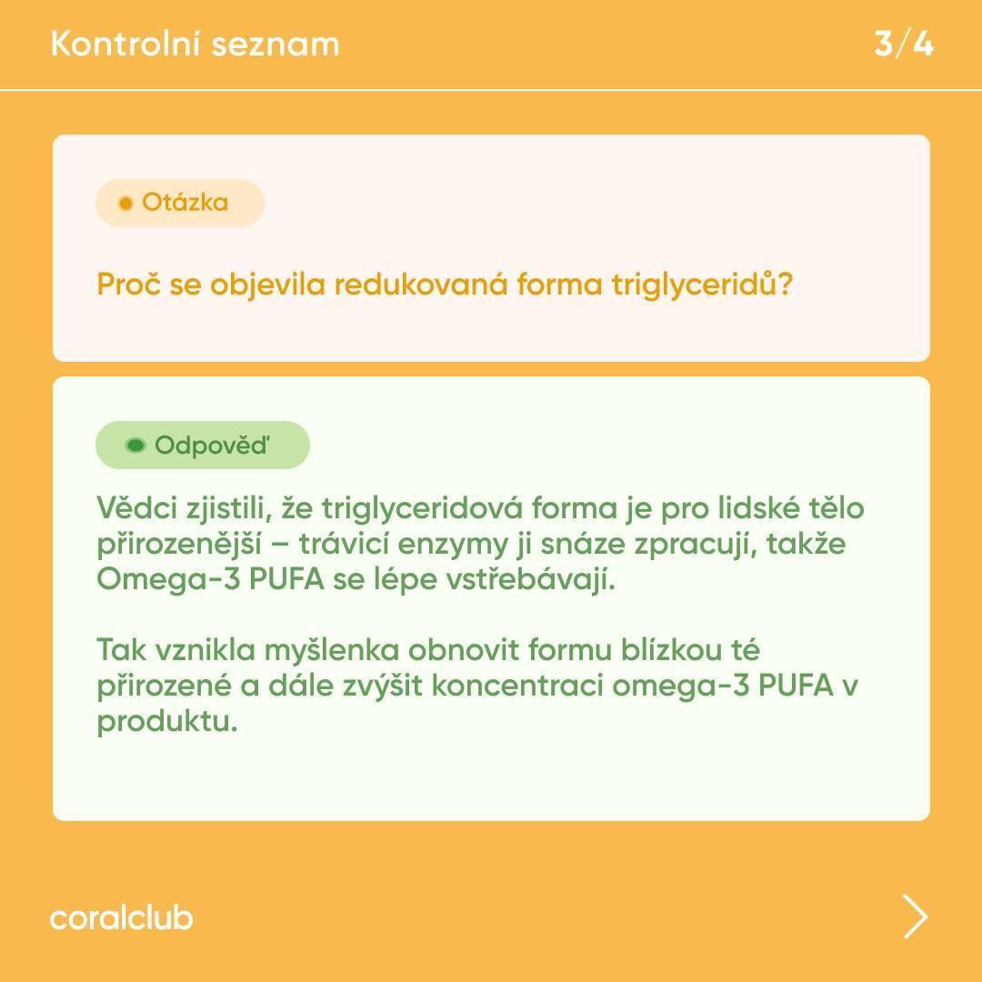 Obnovená triglyceridová forma omega-3 PUFA je svou strukturou blízká té přírodní, proto je organismem snadno a rychle vstřebávána. Vysoká kvalita produktu je zajištěna ekologicky šetrnou technologií čištění rybího oleje Flutex, která umožňuje získat koncentraci omega-3 PUFA 65%.